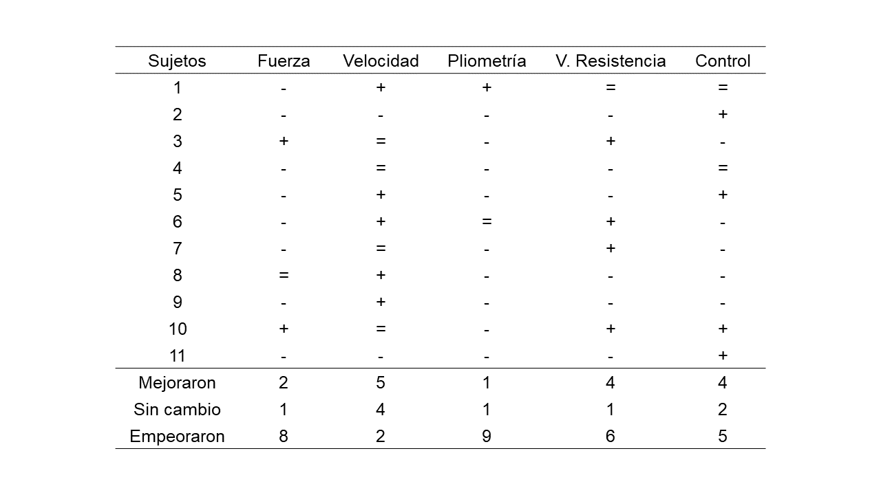 Por su parte, para discutir el análisis individual, se debe contemplar que la carrera de velocidad mejoró en 5 sujetos con el tipo de entrenamiento de velocidad; en 4 sujetos, con el entrenamiento de velocidad contra resistencia y la condición control; en 2 sujetos, con el entrenamiento de fuerza y solo en 1 sujeto con el entrenamiento de pliometría. Se descarta que las discrepancias en los resultados individuales entre tratamientos se deban a diferencias entre las cargas de los protocolos, debido a que todos fueron desarrollados a intensidades máximas o casi máximas, los volúmenes de cada tratamiento fueron similares en tiempos de ejecución (con rangos entre 7 y 12 segundos de ejecución por serie o ejercicios para fuerza y pliometría y por repetición para velocidad y velocidad contra resistencia) y las pausas entre series fueron idénticas.