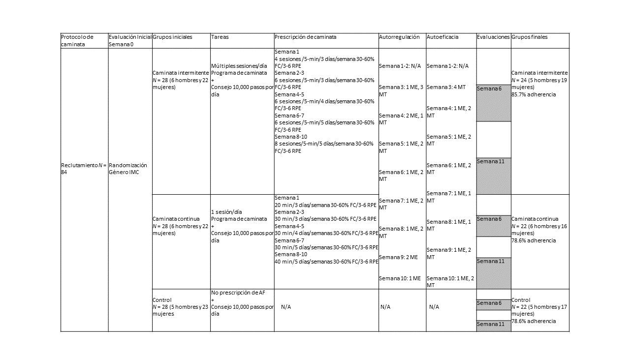 Siguiendo las recomendaciones de Cohen sobre una muestra representativa para el análisis del comportamiento tal como la actividad física (cálculo conservador a1 = .05, r = .30 y potencia = .80, con un tamaño de muestra deseable de 68), se asignaron al azar 84 sujetos (según IMC inicial y sexo) a uno de los tres grupos para completar una intervención de 10 semanas, la cual constó de dos protocolos de caminata; caminata intermitente y caminata continua. Un tercer grupo sirvió como grupo control y no recibió prescripción de ejercicio ni entrenamiento para la autorregulación. La figura 1 muestra el diseño de la intervención. Dieciséis participantes se retiraron del estudio durante las primeras semanas de la intervención y los datos se eliminaron de todos los análisis. Por lo tanto, el tamaño de la muestra final fue de 22 participantes para el grupo continuo, 24 para el grupo intermitente y 22 para el grupo de control.