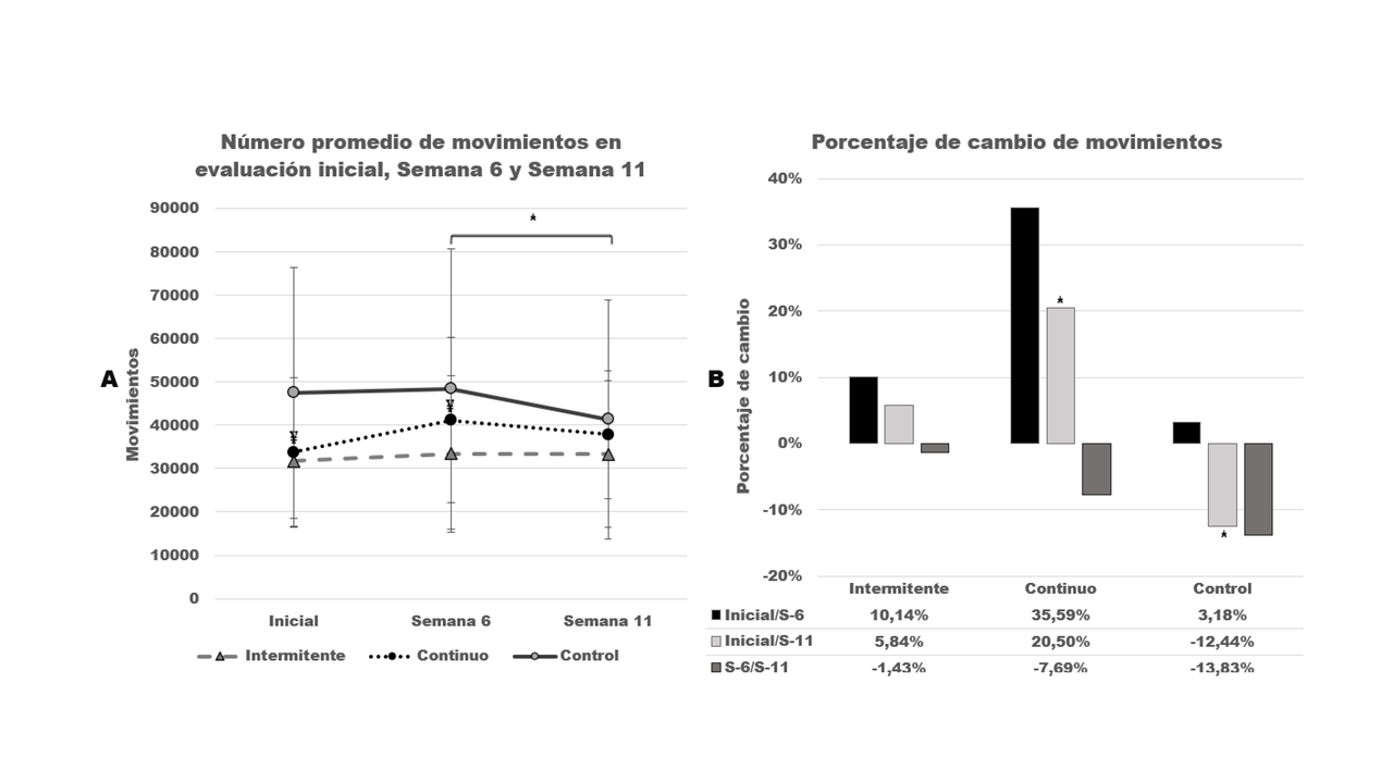 Los resultados de la ANOVA de diseño mixto muestran que, para los tres grupos, la actividad física medida por movimientos cambió significativamente durante el transcurso de la intervención con un efecto principal de tiempo F(2,130) = 4.497, p = .013 y un efecto de tamaño medio de η2 = .065. La actividad física difirió como efecto principal del tiempo por interacción grupal F(4,130) = 2.526, p = .044, con un efecto de tamaño medio de η2 = .072. No hubo un efecto principal del grupo sobre la actividad física medida por medio del movimiento F(2,65) = 2.135, p = 0.107. Se encontró una reducción en los movimientos de la semana 6 a la semana 11 (p = .014) para todos los grupos combinados. La prueba post-hoc de Bonferroni mostró que el grupo de caminata continua aumentó los movimientos desde el inicio hasta la semana 6 (p = .033), no mostró cambios en los movimientos desde la semana 6 hasta la semana 11 y desde el inicio hasta la semana 11 (p > .05).