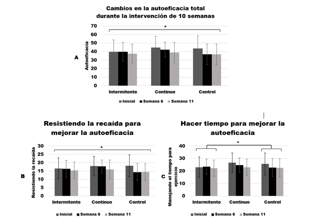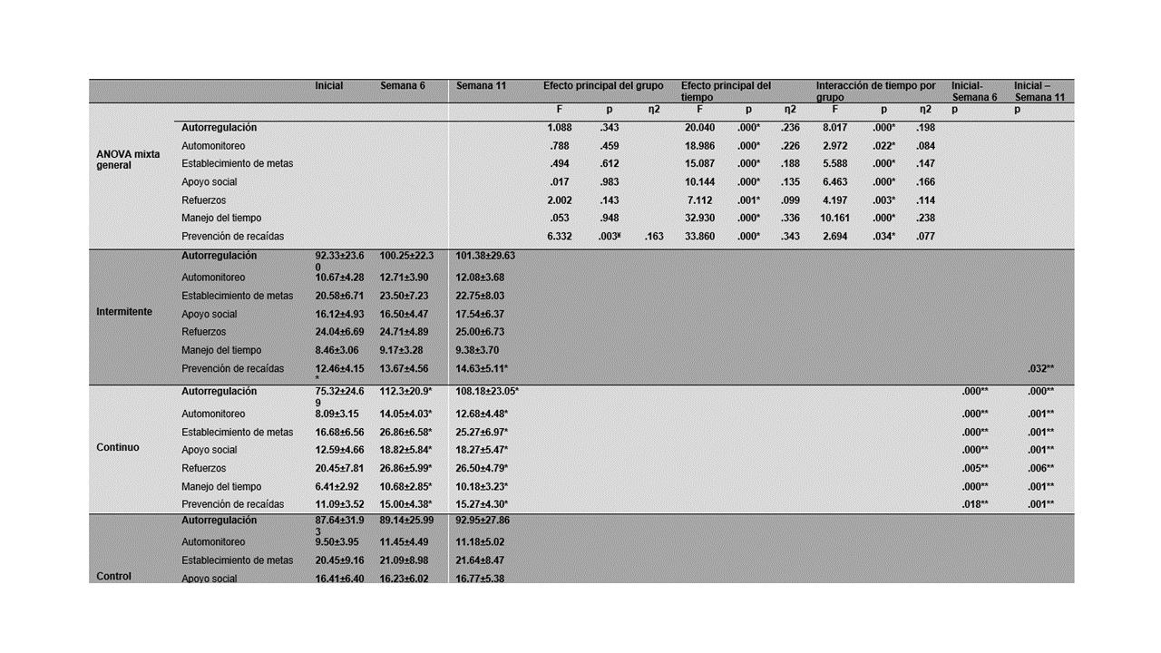 Los resultados de la ANOVA de diseño mixto mostraron que la autorregulación total cambió como efecto principal del tiempo F(2,130) = 20.140, p < .001, con un tamaño de efecto grande de η2 = .236. Al comparar la autorregulación por grupo se encontró una interacción F(4,130) = 8.017, p <.001, y un tamaño de efecto grande η2 = .198. La prueba post-hoc de Bonferroni mostró que, para el grupo continuo, la autorregulación general mejoró desde el inicio hasta la semana 6 (p < .001) y la semana 11 (p < .001). El grupo de caminata intermitente aumentó en la prevención de recaídas desde el inicio hasta la semana 11 (p < .037). El grupo de control no cambió la autorregulación general en la semana 6 ni en la semana 11.