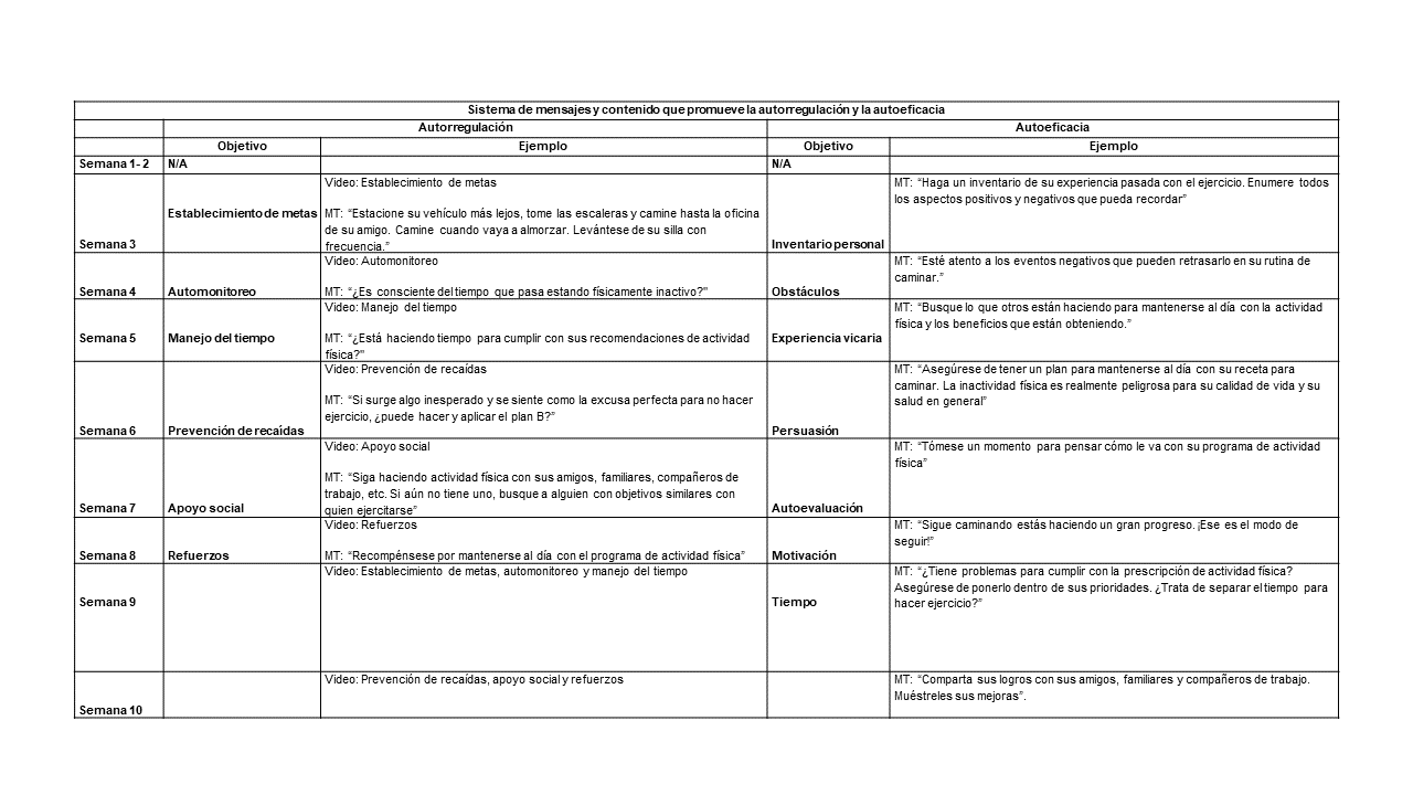La prescripción de caminata de 10 semanas para los grupos intermitente y continuo siguió un aumento escalonado en la práctica de caminata durante 10 semanas. Estos dos grupos fueron educados semanalmente con estrategias para mejorar las habilidades de autoeficacia y autorregulación; se hizo a través de mensajes de texto, correos electrónicos y videos dirigidos a variables específicas como se muestra en la tabla 1. Todos los contenidos se vincularon a tácticas para mejorar el control sobre las acciones personales y para mejorar la confianza en sí mismo, con el fin de cambiar el comportamiento de la actividad física diaria. El grupo de control tuvo acceso a la cuenta MOVband, pero no al programa de caminata ni a las estrategias de autorregulación o autoeficacia que se mencionaron anteriormente.