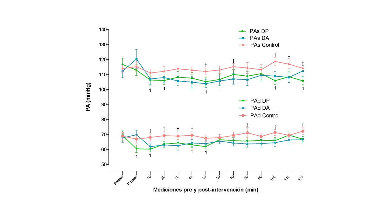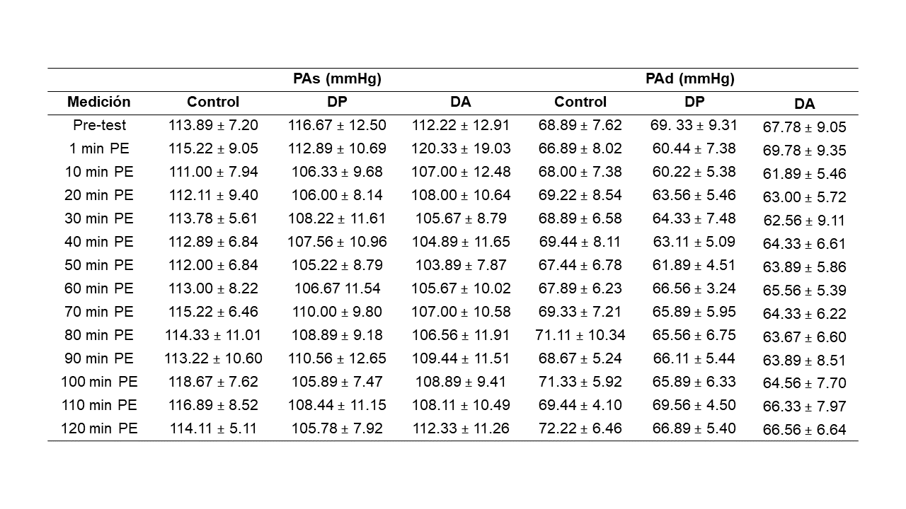 Al dar seguimiento a los resultados obtenidos del análisis de efectos simples, se aplicaron análisis post hoc de Tukey los cuales demostraron que, en comparación con los datos obtenidos en la sesión control: 1) la PAd fue significativamente menor en las mediciones realizadas a los 10 y 40 minutos después de haber ejecutado ECR aplicando DP (p < .05), 2) la PAd fue significativamente menor en las mediciones realizadas a los 20, 30, 80, 100 y 120 minutos después de finalizada la sesión de ECR aplicando DA (p < .05) (ver Figura 1).