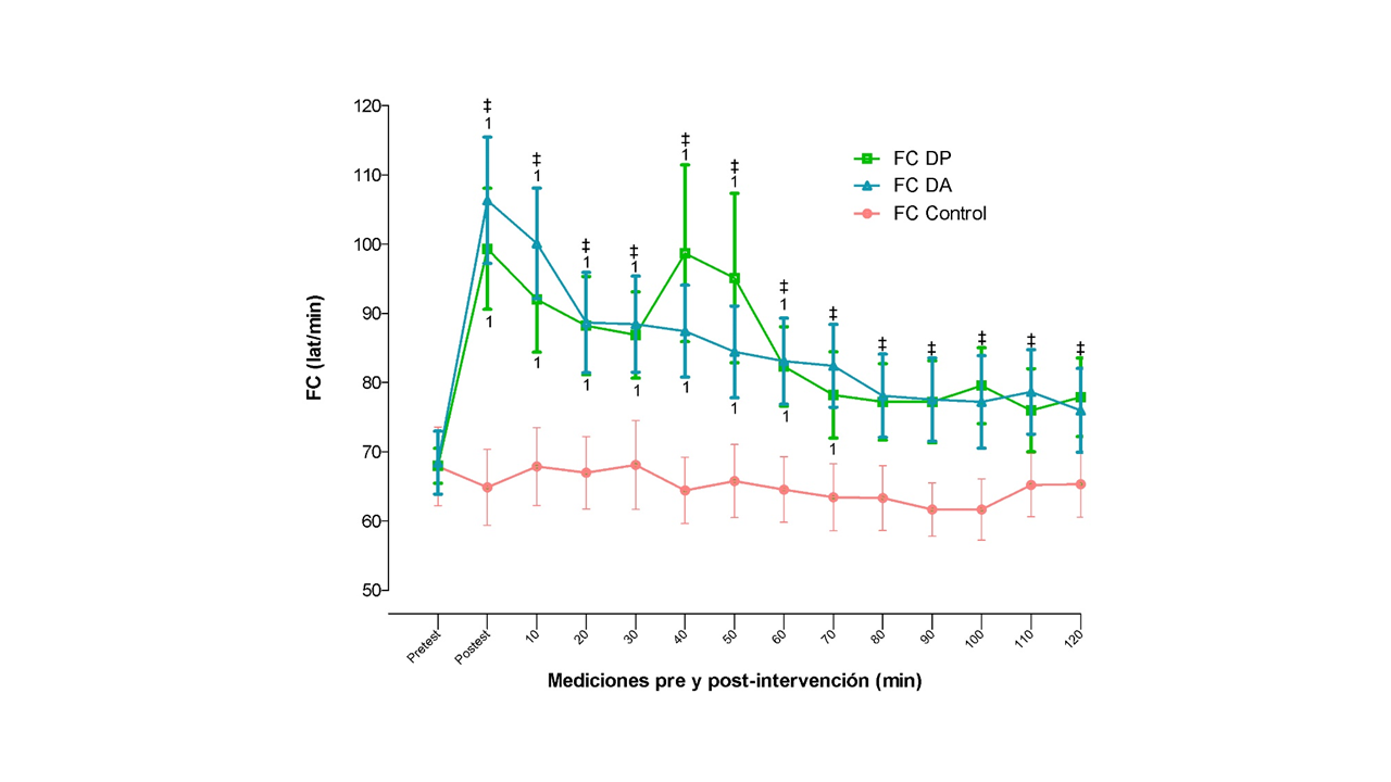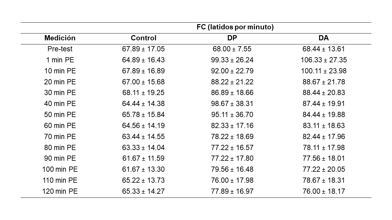 Los análisis post hoc de Tukey evidenciaron que, en comparación con la medición pre-test: 1) la FC se mantuvo aumentada de forma significativa desde el primer minuto post ejercicio y hasta la medición realizada a los 60 minutos después de haber finalizado la sesión de ECR con DP (todos los cálculos con p < .05), 2) la FC se mantuvo aumentada de forma significativa desde el primer minuto post ejercicio y hasta la medición realizada a los 70 minutos después de haber finalizado la sesión de ECR con DA (todos los cálculos con p < .05), 3) después del minuto 60 y posterior al minuto 70 de las sesiones de ECR con DP y DA, respectivamente, los valores de FC volvieron a ser semejantes a los encontrados en el pre-test (todos los cálculos con p > .05).