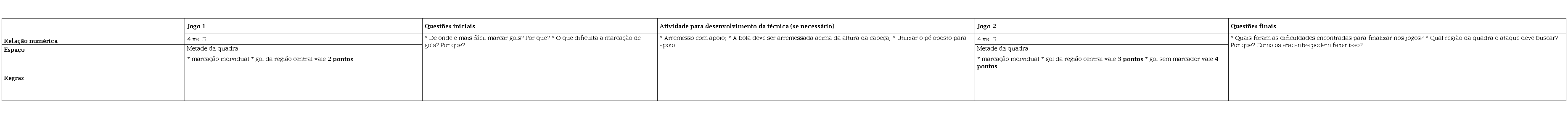 Por meio desse diagnóstico inicial realizado pelos seus alunos o professor passou a elencar os aspectos que também considerava mais relevantes. Na sua concepção deveria priorizar que seus alunos conseguissem finalizar ao gol em um jogo com oposição real e optou por enfatizar, na primeira aula prática, o princípio da finalização. Ele também estabeleceu como regras de ação a busca por finalizar da região central da quadra e, preferencialmente, sem marcação. Assim sendo, ele apresentou o plano de aula mostrado na Tabela 1.