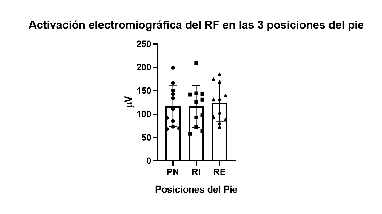 En la Figura 1, se observa el análisis del músculo RF en las diferentes pocisiones de los pies, donde no se indentificó una diferencia significativa en PN x RI (p = .998), PN x RE (p = .926) y RI x RE (p = .904). El tamaño de efecto fue pequeño (d = .008).
