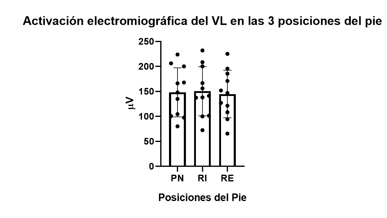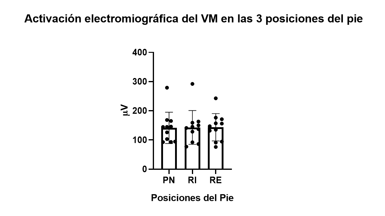El músculo VM matuvo la misma tendencia que el RF, no mostró diferencias significativas entre las posiciones de los pies (PN x RI p = .989; PN x RE p = .996; RI x RE p = .998), con un tamaño del efecto pequeño (d = .066) (Figura 2).