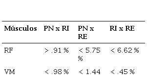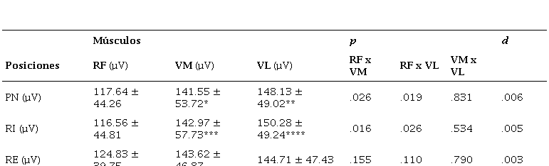 En la Tabla 1 se presenta información relacionada con las comparaciones electromiográficas entre los músculos en cada posición de los pies. Al analizar la interferencia de la PN en la activación de los músculos RF, VM y VL, se verificó una diferencia significativa entre el RF en comparacaión con los demás músculos, VM y VL (RF x VM - p = .026; RF x VL - p = .019). Entre los músculos VM y VL no hubo diferencias significativas (p = .831). El tamaño del efecto demostrado fue pequeño (d = .006).