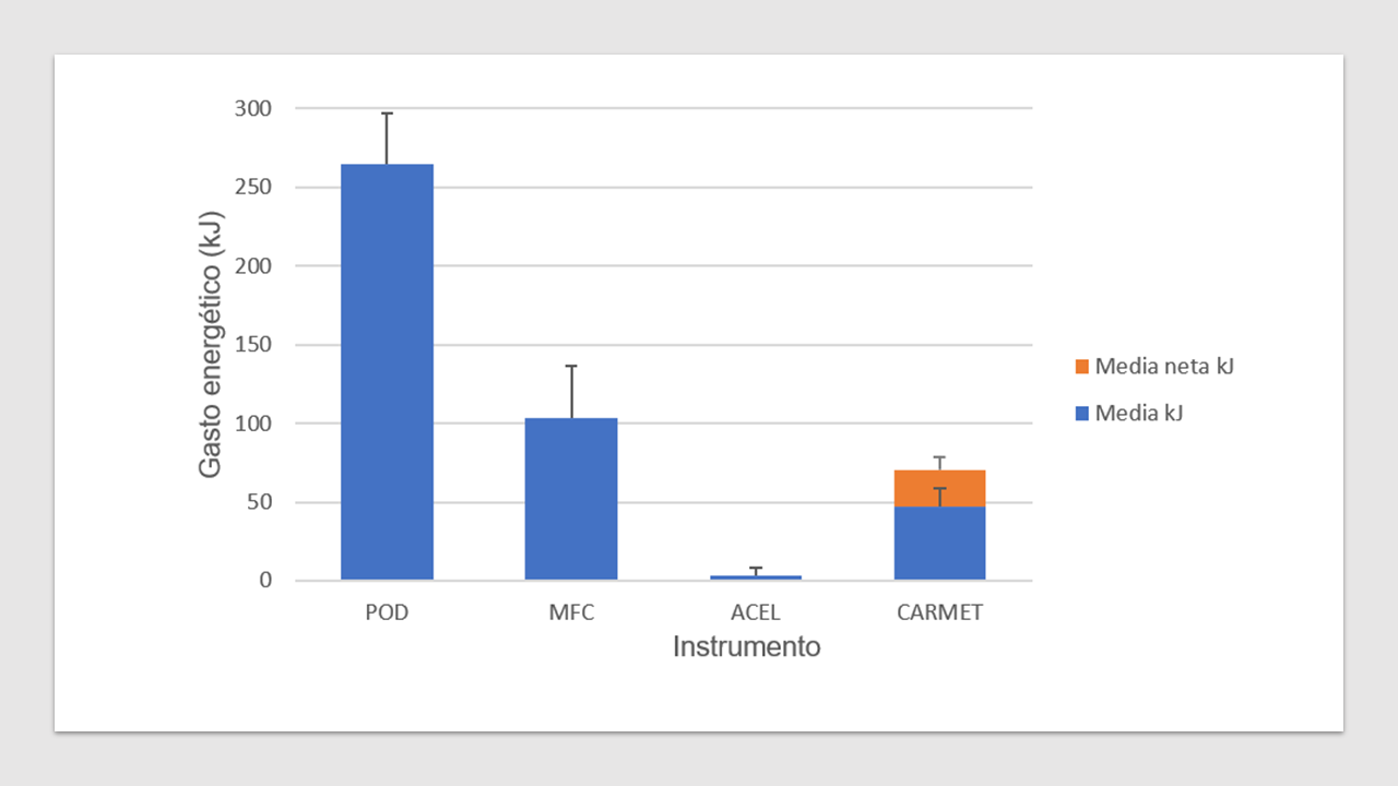 La Figura 1 muestra el gasto energético calculado con cada uno de los instrumentos. Durante EJER, el gasto energético estimado más alto fue el obtenido con POD = 265.0 ± 31.8 kJ (63.3 ± 7.6 kcal) (bruto), correspondientes a un registro de 2099.1 ± 250.5 “pasos”. MFC registró 103.4 ± 33.1 kJ (24.7 ± 7.9 kcal) (bruto), en tanto que ACEL registró 3.3 ± 5.0 kJ (.8 ± 1.2 kcal) durante esos mismos 10 min. La intensidad del ejercicio medida con CARMET fue de 1.54 ± .23 MET, lo cual corresponde a un gasto neto de 23.4 ± 9.2 kJ (5.6 ± 2.2 kcal) o 70.3 ± 11.7 kJ (16.8 ± 2.8 kcal) de gasto bruto durante los diez minutos.