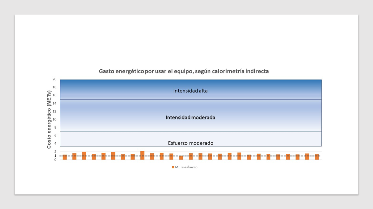 En la Figura 2 se pueden observar los MET registrados por cada participante con la perspectiva del esfuerzo que ello representa, según la clasificación de intensidades de ejercicio de la Oficina para la prevención de las enfermedades y promoción de la salud de los EE.UU. (Office of Disease Prevention and Health Promotion [ODPHP], 2008). Todos los participantes registraron esfuerzo que se clasifica como “liviano” (menor a 3 MET).