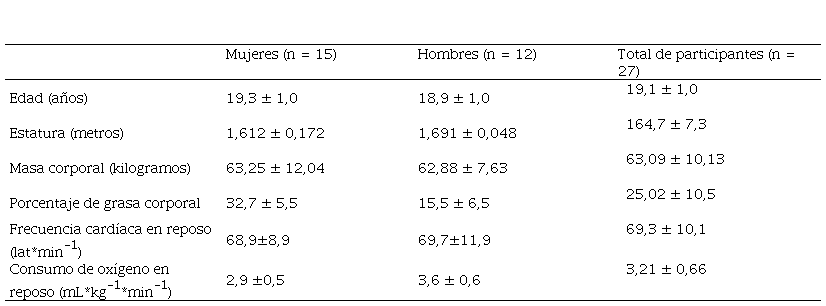 Todos los datos se presentan como M ± DT. Las personas evaluadas tenían 19.1 ± 1.0 años, con una estatura de 1.647 ± .073 m, una masa corporal de 63.09 ± 10.13 kg y con 25.0 ± 10.5% de grasa corporal. En reposo, su VO2 = 3.2 ± .7 mL*kg-1*min-1 y su frecuencia cardíaca = 69.3 ± 10.1. En la Tabla 1 se resumen estos datos para mujeres y hombres; la base de datos crudos está disponible en Montoya Arroyo, Ramírez Cambronero y Aragón Vargas (2021).