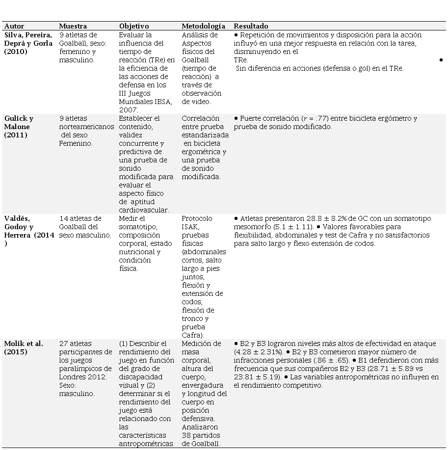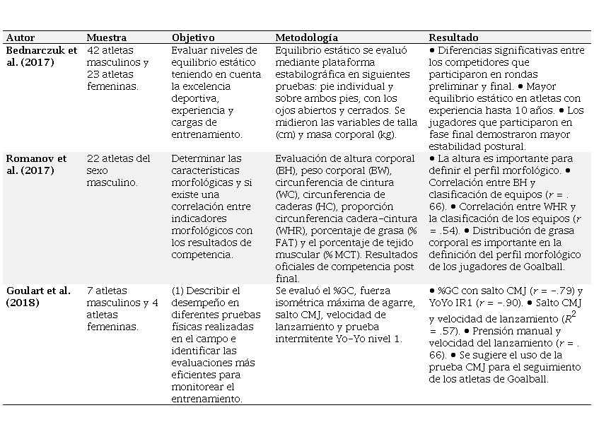 Los estudios proporcionaron datos a través de metodologías como la filmación, análisis de video, aplicación de pruebas físicas, test y antropometría (protocolo ISAK) para determinar, entre otros aspectos, la influencia de tiempo de reacción en la eficiencia de las defensas, aptitud cardiovascular, composición corporal, morfología, rendimiento de juego en relación a la discapacidad y niveles de equilibrio estático según experiencia, cargas de entrenamiento y excelencia deportiva. En el estudio de Valdés et al. (2014), se realizaron mediciones antropométricas, determinando que los atletas de Goalball de la región de la Araucanía (Chile) presentan un somatotipo mesoendomorfo con un porcentaje de grasa corporal (%GC) de 28.78 ± 8.21% y un 42.71% de masa muscular; sin embargo, aunque evaluaciones como la altura y el %GC son importantes para determinar el somatotipo de los atletas de Goalball (Romanov et al., 2017), las variables antropométricas y de composición corporal no son determinantes en el lanzamiento del balón de Goalball (Campos et al., 2020), así como tampoco lo son la medición de masa corporal, altura del cuerpo, envergadura y longitud del cuerpo, en el rendimiento competitivo (Molik et al., 2015), lo que difiere de las investigaciones en deporte convencional (Quintero, Orsatto, Pulgarin, y Follmer, 2019).
