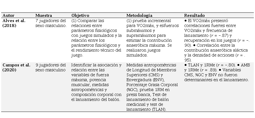 Entre las investigaciones referidas al componente de rendimiento físico, se evidencian relaciones entre parámetros fisiológicos obtenidos en laboratorio y juegos simulados o el rendimiento técnico del juego (Alves et al., 2018), donde existen correlaciones muy probables entre el VO2máx en condición de laboratorio con la frecuencia de lanzamiento (r = .87) y la recuperación en los juegos (r = .9). Destaca la importancia del metabolismo aláctico, al determinar una correlación muy probable entre la contribución aláctica y la densidad de acción (r = .95).