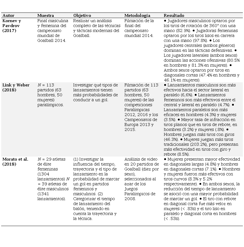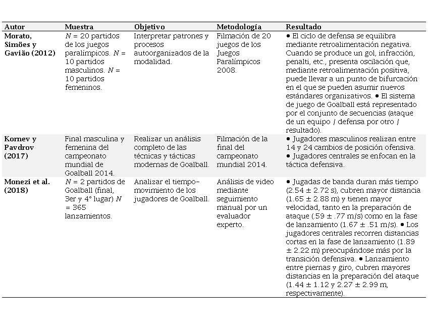 Finalmente, en relación con aspectos tácticos en el Goalball, se encontró un estudio que no se incluye en la revisión sistemática, pero que es fundamental conocer dentro de la modalidad, en donde los autores desarrollaron un sistema de observación para el análisis de partidos de Goalball mediante una planilla basada en seis orígenes de las áreas de juego, el cual es un instrumento de gran importancia para los entrenadores y/o profesores enfocados en la evaluación de los aspectos técnicos, rendimiento físico, psicológico y, por sobre todo, para analizar los aspectos tácticos de la modalidad (Morato, da Cunha Furtado, Gamero, Magalhães, y de Almeida Gavião, 2016).