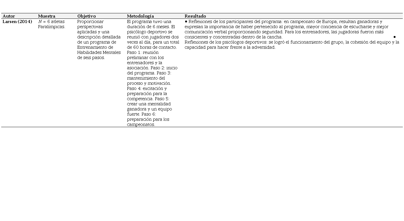 Pocos autores han discutido cómo un psicólogo deportivo puede trabajar con atletas con discapacidad (Hanrahan, 1998), y la mayor parte de la literatura se centra en el desarrollo de habilidades mentales específicas (Martin, 1999, citado en Larsen, 2014). En esta investigación, se encontró un artículo en el área de psicología referido a la aplicación de un programa de entrenamiento de habilidades mentales en alto rendimiento y se obtuvieron reflexiones por parte del entrenador y jugadoras destacando la importancia de haber sido parte de este programa, favoreciendo su consciencia, comunicación verbal y, a decir de los entrenadores, mayor conciencia y concentración durante la competencia. Por otra parte, los psicólogos deportivos del equipo hacen referencia al funcionamiento, cohesión y capacidad de hacer frente a la adversidad, lo que finalmente les permitió ser Campeonas de Europa y clasificar a los Juegos Paralímpicos de Londres 2012.