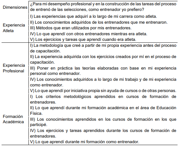 Para la recolección de datos se utilizó el Cuestionario de perfil de Formación del Entrenador (QPFT, por sus siglas en portugués), originalmente propuesto por Feu et al. (2012) en idioma español, traducido y adaptado al escenario brasileño por Mendes et al. (2019), que establece las procedencias de las fuentes de conocimiento de los entrenadores en tres dimensiones: Formación Académica (FA), Experiencia de Atleta (EA) y la Experiencia Profesional (EP). Cada dimensión posee cinco indicadores que contemplan los momentos de aprendizajes, experiencias, conocimientos, metodologías y ejercicios vivenciados por los entrenadores (Tabla 1). El instrumento está compuesto de 15 preguntas con respuestas en escala tipo Likert de 1 a 10 (1 = Completamente en Desacuerdo y 10 = Completamente de Acuerdo). Además, se adaptó la pregunta original del instrumento, la cual comprende: “¿Para mi desempeño profesional en la construcción de las tareas del proceso de entreno de las selecciones, como entrenador yo prefiero?”.