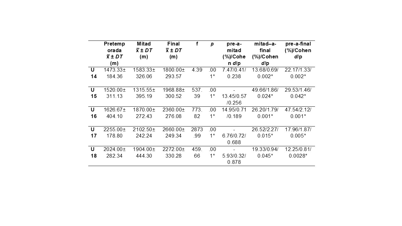 Los resultados de todos los grupos en la prueba Yo-YoIRT1 en los diferentes momentos se presentan en la Tabla 2. El resultado obtenido en el Yo-YoIRT1 en la categoría U14 aumentó en 7.47% a mitad de temporada en comparación con el inicio de la temporada; en 13.68% al final en comparación con la media temporada y en 22.17% comparando el final con el inicio de la temporada. En la categoría U15, el rendimiento disminuyó un 13.47% a mitad de temporada en comparación con el inicio de la temporada; aumentó en 49.66% al final en comparación con la media temporada y en 29.53% comparando el final con el inicio de la temporada. En la categoría U16, el rendimiento en la prueba Yo-YoIRT1 aumentó en 14.95% a mitad de temporada en comparación con el inicio de la temporada; en 26.20% al final en comparación con la media temporada y en 47.54% comparando el final con el inicio de la temporada. En la categoría U17, el rendimiento disminuyó un 6.76% a mitad de temporada en comparación con el inicio de la temporada; aumentó en 26.52% al final en comparación con la media temporada y en 17.96% comparando el final con el inicio de la temporada. Finalmente, en la categoría U18, la distancia recorrida disminuyó un 5.93% a mitad de temporada en comparación con el inicio de la temporada; aumentó en 19.33% al final en comparación con la media temporada y en 12.25% comparando el final con el inicio de la temporada.