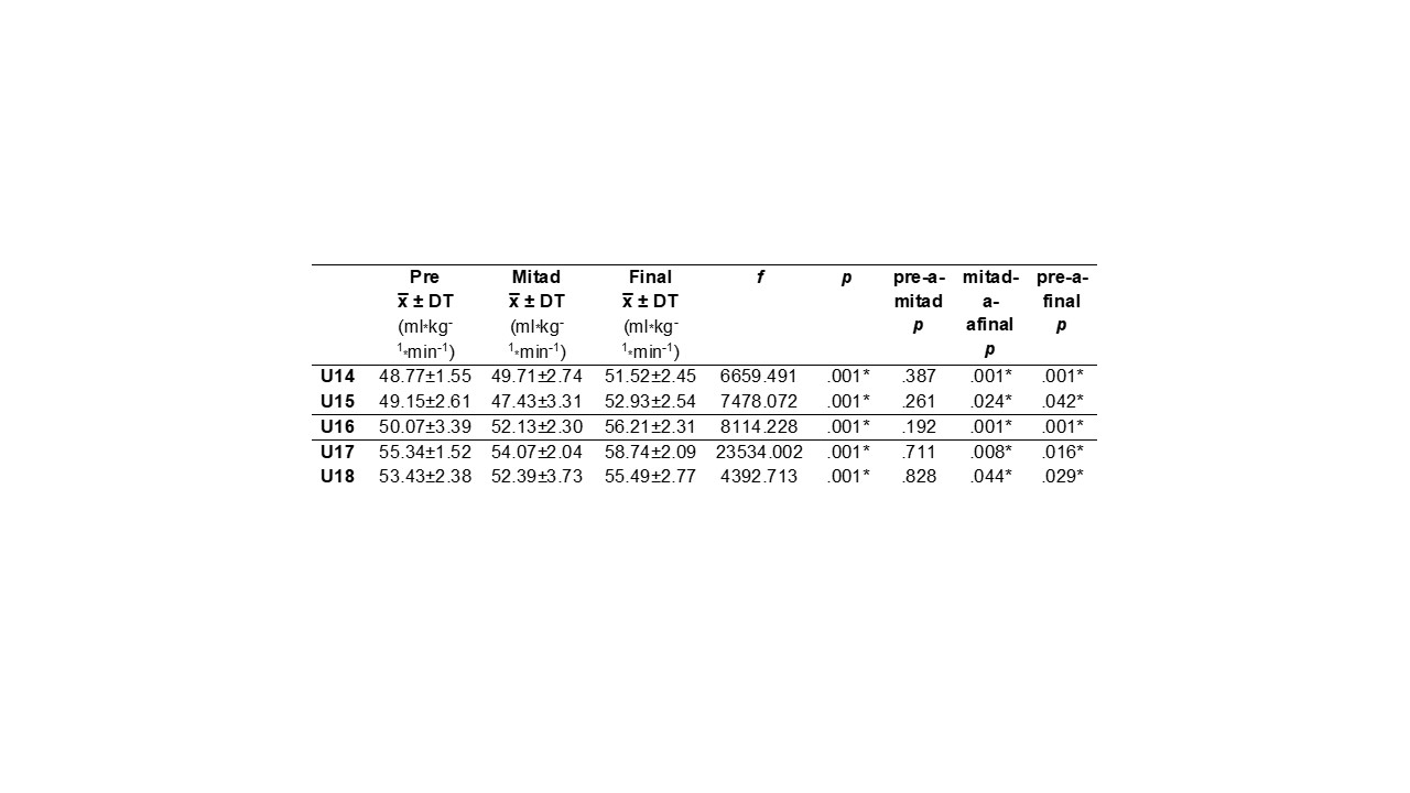 En la categoría U14, el consumo máximo de oxígeno estimado aumentó de 48.77 ml*kg-1*min-1 en la pretemporada, a 49.71 ml*kg-1*min-1 a mitad de temporada y a 51.52 ml*kg-1*min-1 al final. En la categoría U15, disminuyó de 49.15 ml*kg-1*min-1 al inicio de la temporada, a 47.43 ml*kg-1*min-1 en la mitad, pero subió a 52.93 ml*kg-1*min-1 al final de la temporada. Para la categoría U16, ocurrió un aumento desde 50.07 ml*kg-1*min-1 en la pretemporada hasta 52.13 ml*kg-1*min-1 a mitad de temporada y hasta 56.21 ml*kg-1*min-1 al final. Los participantes de la categoría U17 bajaron su consumo máximo de oxígeno estimado de 55.34 ml*kg-1*min-1 en la pretemporada a 54.07 ml*kg-1*min-1 en la mitad, pero lo aumentaron a 58.74 ml*kg-1*min-1 al final de temporada. En la categoría U18, disminuyó de 53.43 ml*kg-1*min-1 al inicio a 52.39 ml*kg-1*min-1 a mitad de temporada, pero aumentó a 55.49 ml*kg-1*min-1 al final.