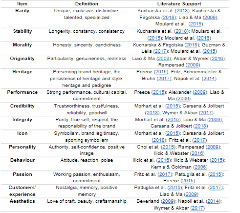 An athlete’s on-field attributes can be defined as an athlete’s performance-related characteristics, such as their behaviour, team, achievements, style of play and skills (Arai et al., 2014; Hasaan et al., 2018). In this context, this study found 14 attributes that are included in the athlete's brand authenticity as related to the athlete’s on-field activities. These are rarity, stability, morality, originality, heritage, performance, credibility, integrity, icon, personality, behaviour, passion, customer’s experience and aesthetics (see Table 1 for further details).