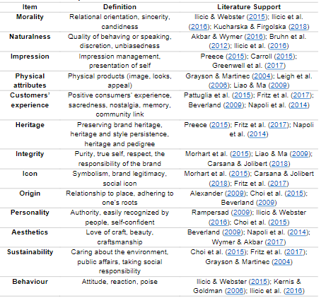 Some authors have categorized brand authenticity into two dimensions: internal authenticity and external authenticity (Gilmore & Pine, 2007; Spiggle, Nguyen, & Caravella, 2018). Internal authenticity is achieved via internal consistency (i.e., a brand is true to itself) and external authenticity is achieved via external consistency (i.e., a brand is what it appears to be; Spiggle et al., 2018). Moreover, authenticity has been categorized into three dimensions: objective, constructive and postmodern (Lu, Gursoy, & Lu, 2015). The objectivist perspective suggests that brand authenticity perceptions arise from an evidence-based reality (Morhart et al., 2015). The constructivist perspective suggests that brand authenticity is dependent on the context, as authenticity is a subjective, socially and personally constructed perception of objects and cultures (Lu et al., 2015; Reisinger & Steiner, 2006). Lastly, the postmodernist perspective suggests that consumers are likely to judge authenticity based on their emotional experiences of the brand (Leigh, Peters, & Shelton, 2006). In contrast, Stiehler & Tinson (2015) described three types of authenticity: pure authenticity (judgements of an item or experience), approximate authenticity (iconic referents that reflect the consumer’s perception) and moral authenticity (brand’s commitment to social programs). Most recently, Fritz, Schoenmueller & Bruhn (2017) noted that brand authenticity is interpreted via two cues, namely the indexical and iconic cues (i.e., indexical cues provide perceived evidence to customers, while iconic cues are the perceived connection that provide evidence of authenticity to customers).