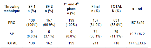 We can conclude that athletes perform FRO throws to a greater extent. This may be due to the complexity in the technique and tactics involved in the SP throw, and this being an important aspect to consider in the athlete's sports preparation.