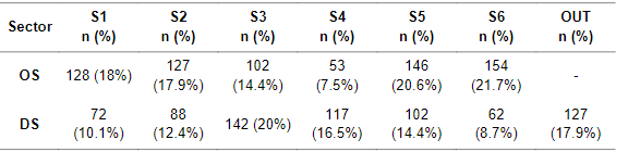 The trajectory of the throw, regarding origin sector and destination sector, is described below in Table 2. It was observed that the full-back positions originated a greater number of throws, being mostly defended by the central positions (S3 and S4). When the throws were directed towards peripheral positions, a high percentage of OUT throws was evidenced.