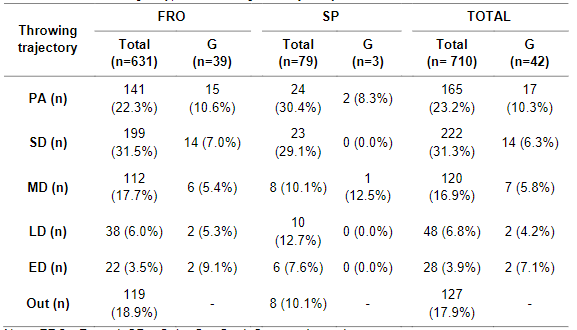 Analyzing the trajectory effectiveness by type of throw, we visualize that the PA trajectory presents an effectiveness rate of 10.6% in the FRO throw. The SP throw, on the other hand, presents a greater effectiveness in the MD trajectory (12.5%).