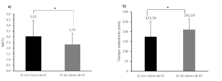 Los datos son presentados en media y desviación típica. Para establecer diferencias entre jornada escolar con y sin clase de educación física y salud se utilizó la prueba no paramétrica de Wilcoxon. *p< .0001. En la Figura 1a se presentó la cantidad de MET y en la Figura 1b los minutos que pasan en actividades sedentarias los escolares en jornada escolar con clases y sin clases de educación física. Los escolares en jornada escolar sin clase de educación física se encontraban en la categoría de actividad física ligera (1.5 -3 MET) mientras que durante la jornada con clase de educación física en la categoría de actividad física moderada (3-6 MET). En comparación con los días que no tenían clases de educación física, se observó que en los días que los escolares si tenían clases de educación física realizaron significativamente mayor cantidad de MET y tuvieron menor cantidad de tiempo sedentario (Z = -3.944; p< .0001), (Z = -4.149; p < .0001), respectivamente.