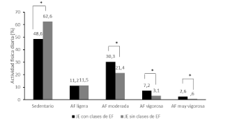 Los datos son presentados en media. Para establecer diferencias entre jornada escolar con y sin clase de educación física y salud se utilizó la prueba no paramétrica de Wilcoxon. *p < .0001. En la Figura 2 se presentó la intensidad de actividad física de escolares en jornada escolar con clases y sin clases de educación física. Se observó que, en relación con los días que los escolares no tenían clases de educación física, los que si tenían presentaron significativamente menor porcentaje de actividad sedentaria, mayor de actividad física moderada, vigorosa y muy vigorosa (Z = -4.474; p < .0001), (Z = -4.430; p < .0001), (Z = -5.403; p < .0001) y (Z = -3.940; p = .0001), respectivamente.