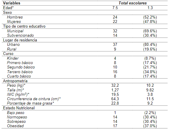 En la Tabla 1 se presentó la caracterización de los escolares evaluados. Los escolares mayormente fueron hombres (52.2%). En promedio, la muestra tenía 7.5 años. Porcentualmente, la mayoría de los escolares provenía de centros educativos municipalizados y urbanos. De acuerdo con el IMC calculado, un 67.4% presentó malnutrición por exceso (sobrepeso + obesidad).