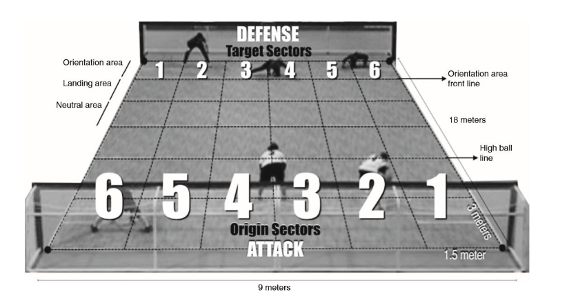 Para el análisis de los partidos se utilizó el diagrama propuesto por Morato et al. (2016) utilizando los sectores de origen determinados por el primer toque del balón lanzado y el sector de destino determinado cuando el balón alcanza la línea de frente al área de orientación o es bloqueado por un defensor (Figura 1).