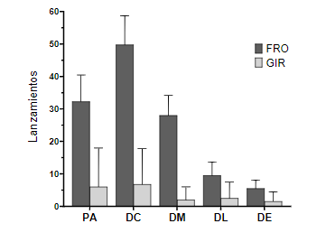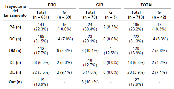En la Figura 3, los datos de la trayectoria de lanzamiento (FRO y GIR) se presentan de acuerdo con la descripción de Morato (2012). Esto indica que los deportistas utilizan preferentemente trayectorias cortas (PA y DC), en la técnica FRO y GIR (ver Figura 2).