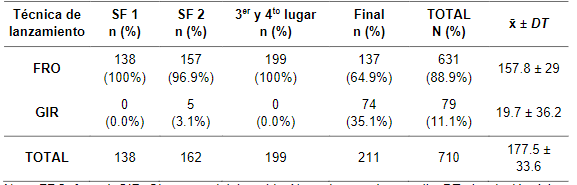 En la Tabla 1 se muestran los valores descriptivos según el tipo de lanzamiento: frontal (FRO) y giro (GIR). No se consideró el lanzamiento entre piernas (EP), ya que no se realizaron lanzamientos EP durante la competencia. Se observó que el lanzamiento de FRO durante el partido de 3er y 4to lugar representó el 28.03% del total de lanzamientos de FRO de la fase eliminatoria y fue superior al resto de los partidos; por otro lado, el lanzamiento GIR se ejecutó principalmente en el partido final, con un 10.4% de los lanzamientos realizados en la fase eliminatoria.