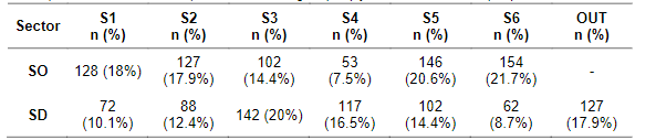 La trayectoria del lanzamiento, en cuanto a sector de origen y sector de destino, se describe en la Tabla 2. Se observó que las posiciones de lateral originaron un mayor número de lanzamientos; en su mayoría, fueron defendidas por las posiciones centrales (S3 y S4). Cuando los lanzamientos fueron dirigidos hacia posiciones periféricas, se evidenció un alto porcentaje de lanzamientos OUT.