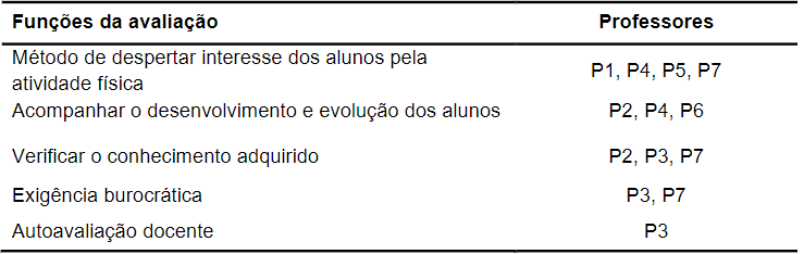 No contexto investigado, a avaliação assumia várias funções na prática pedagógica da educação física, sendo utilizada tanto como método de despertar o interesse dos alunos pela aula, quanto de acompanhar o desenvolvimento ou a evolução e ainda de verificar a aquisição de conhecimento. Além de perceber a avaliação como uma exigência burocrática da escola, os professores indicaram o seu uso como possibilidade de avaliação da própria prática pedagógica.