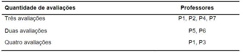 De maneira geral, o sistema de avaliação é desenvolvido pelos professores de acordo com o que se preconiza no projeto político pedagógico da escola, que determina pesos, estratégias ou instrumentos para a coleta de dados e a distribuição no período letivo (trimestre/bimestre). No contexto pesquisado, a maioria dos professores realizava três avaliações no trimestre, o que significa que os alunos tinham mais oportunidades de demonstrar a evolução do conhecimento e os professores a possibilidade de coletar mais amostras do aprendizado para construir a nota no final de cada trimestre. Isso também reflete nas formas diferenciadas de avaliação que cada professor aplica, promovendo a igualdade de conhecimentos e respeitando as particularidades dos seus alunos, possibilitando ao aluno expressar o conhecimento de formas diferentes entre elas provas práticas, teóricas, trabalhos e seminários.