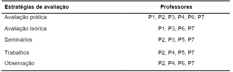 A Tabela 3, demonstra a diversidade de estratégias de avaliação e fontes de recolha de dados sobre a aprendizagem dos alunos, entre eles as avaliações práticas e teóricas, seminários, trabalhos e observações no decorrer das aulas.