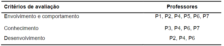 Nota-se que os professores avaliavam o envolvimento do aluno e o comportamento, atribuindo conceito a partir da sua observação durante a aulas, como explica o P5, “uma das principais coisas que avalio em todas as aulas, é a atitude. Temos uma avaliação de atitude que são 10 questões, e eles já sabem no primeiro bimestre como acontece essa avaliação, em cima de vários aspectos: cuidado com o material, pontualidade, participação em aula, cuidado com o colega, o que acontece durante a aula mesmo. Então assim, ele já sabe como é avaliado, e não sai uma nota para eles do nada”.