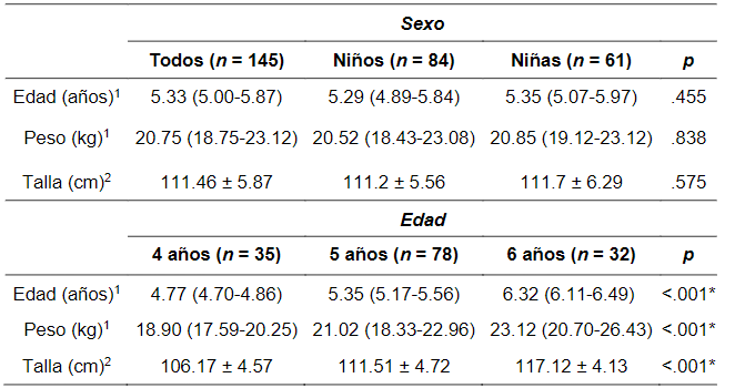 En la Tabla 1 se presentan las características descriptivas de los y las participantes del estudio, aquellas variables que distribuyeron normal fueron presentadas como media y desviación típica (±), y aquellos sin distribución normal se presentaron como mediana y percentiles (25-75). No se apreciaron diferencias por sexo en los parámetros antropométricos, sin embargo, se observan diferencias por edad.