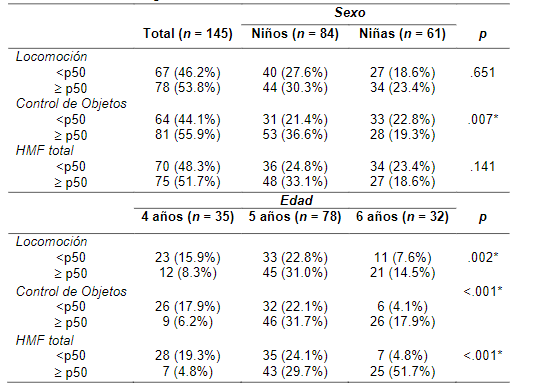 En relación con la edad, los preescolares de 5 y 6 años obtuvieron mayormente puntajes £ p50 en las habilidades de locomoción, control de objetos y HMF total comparado con los preescolares de 4 años, quienes poseían mayormente puntajes <p50. Se encontraron diferencias significativas por edad en las habilidades de locomoción (p = .002), control de objetos (p <.001) y HMF total (p <.001).