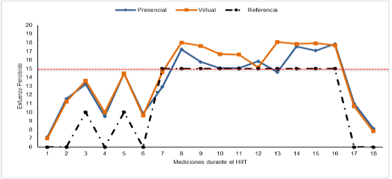 En la Figura 1 se muestra el comportamiento del EP de los participantes en la sesión virtual y presencial. En promedio, en ambas condiciones durante el calentamiento, el EP estuvo por debajo del valor meta de 15. Cuando se realizó la sesión de ejercicio, se presentó un EP superior a 15, según lo esperado. En ambas sesiones, el EP se encontró o fue superior a 15 en las mediciones de la 8 a la 16. Por su parte, en las mediciones del enfriamiento (17 y 18) el EP estuvo por debajo de lo esperado. Cabe resaltar que, en promedio, el EP durante las actividades de HIIT estuvo igual o superior a lo planteado por la literatura (Clark et al., 2020; Coquart et al., 2012; Elsangedy et al., 2013).