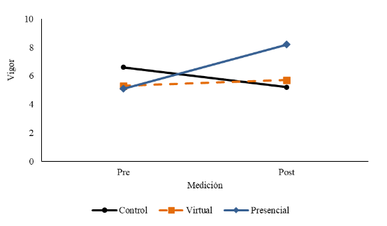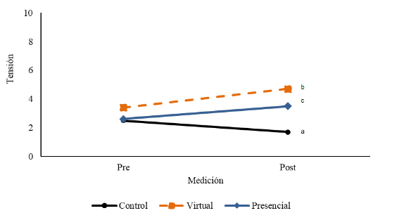El análisis de efectos simples de la interacción en vigor sugiere que la actividad presencial presentó un aumento de pre a post que fue significativo al final de la sesión presencial en comparación con la actividad control (Figura 2). En tensión, sugiere que la actividad presencial presentó un aumento significativo de pre a post, mientras que en el post test la actividad presencial es diferente que la actividad control (Figura 3). El análisis de potencia a posteriori, indicó un valor de 80%, 76%, 65%, 68% y 72%, para fatiga, vigor, cólera, depresión y tensión, respectivamente.
