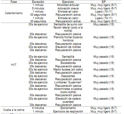 El HIIT ha tomado fuerza en los últimos años como un método para aumentar la resistencia cardiovascular, el consumo máximo de oxígeno, el gasto energético, el volumen sistólico, el umbral de lactato y disminuir los porcentajes de grasa basando los entrenamientos en ejercicios cuya duración es corta, pero de intensidad alta con periodos de pausa activa de baja intensidad o pausa completa (Cofré-Bolados et al., 2016; Peñailillo et al., 2016; Weston et al., 2014). Para que el entrenamiento HIIT sea efectivo, deben alcanzarse niveles de intensidad apropiados, los cuales pueden estar determinados por la frecuencia cardíaca, el consumo máximo de oxígeno y la acumulación de lactato en sangre; sin embargo, dichos métodos pueden resultar costosos y requieren de una calibración previa (Meyer et al., 2015). En la actualidad, la Escala de Esfuerzo Percibido (EP) ‒la cual tiene una puntuación de 6 a 20‒ es una herramienta útil para conocer de manera subjetiva la intensidad a la cual la persona se ejercita, y ha demostrado tener una asociación con los valores de frecuencia cardíaca y la acumulación de lactato en sangre (Scherr et al., 2013) y el consumo máximo de oxígeno (McCulloch et al., 2018). Además, previamente ha sido propuesta como una escala adecuada para llevar a cabo entrenamientos HIIT, en la cual un valor de 15 o superior ya lo ubica en la intensidad deseada para este método de entrenamiento (Ciolac et al., 2015; López y Vicente, 2018).