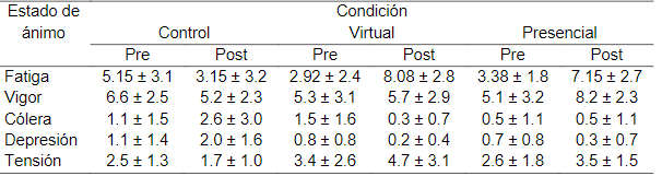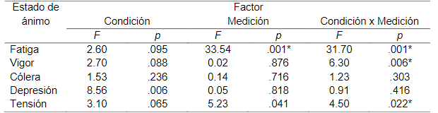 Al aplicar un ANOVA de 1 vía en la medición del pretest, no se encontraron diferencias al inicio de cada condición en las variables de vigor, cólera, depresión y tensión (p > .05); no obstante, sí se encontraron diferencias en la fatiga (F = 6.909, p = 0.004), donde en la condición control se inició con una fatiga significativamente mayor que en las otras dos condiciones. En la mayoría de las variables se cumplió el supuesto de esfericidad (Prueba de Mauchly; p > .05). En las variables donde no se cumplió (cólera y depresión) se reportó el estadístico de Greenhuse-Geisser. No se encontró una relación significativa entre la edad de los participantes y los datos del pretest, por lo que la edad no se consideró como una covariable en el estudio.
