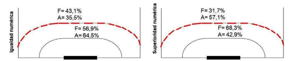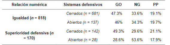 Considerando las situaciones de superioridad numérica defensiva, el uso de los sistemas defensivos abiertos se mostró más eficaz, a diferencia de lo observado en situaciones de igualdad numérica. Este hecho demuestra que la elección de los sistemas defensivos, cuando el equipo se encuentra en superioridad numérica, influye los resultados de las acciones y el cumplimiento de los objetivos de los jugadores adversarios. La eficacia en la utilización de los sistemas defensivos abiertos (en superioridad numérica) puede estar relacionada con la constante perturbación a la que son sometidos los atacantes y a la ruptura del ritmo ofensivo, que dificulta el acceso a las regiones más cercanas a la portería y el aumento en la presión espacio-temporal para la toma de decisiones de los atacantes (Fernández Romero et al., 1999; Menezes, 2011).