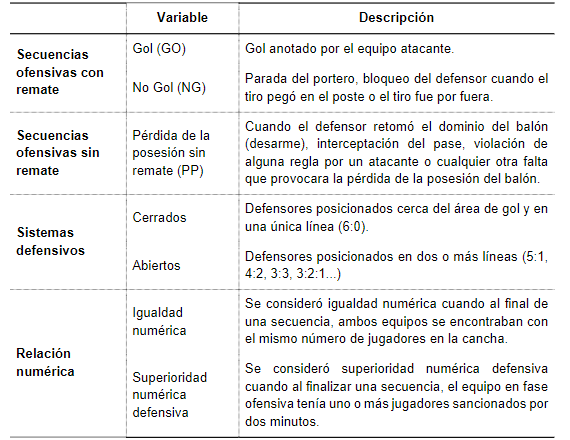 Para estandarizar los análisis y debido a la familiaridad de los investigadores con el software, los juegos fueron observados por medio del software gratuito Kinovea® v.0.8.15 y los datos se tabularon en una hoja de cálculo electrónica ad hoc, almacenados en el Google Drive®. Todo el protocolo de análisis se basó en indicadores de rendimiento (Hughes y Bartlett, 2002) durante el juego posicionado (excluyéndose, por tanto, las transiciones) para identificar los resultados de las acciones ofensivas, la posesión del balón, el sistema defensivo, la relación numérica (atacantes vs. defensores) y la región de la cancha donde el ataque terminó. Para las relaciones numéricas fueron analizadas, solamente, las situaciones de superioridad e igualdad, ya que en inferioridad numérica los equipos utilizaron, únicamente, sistemas defensivos cerrados. En la Tabla 1 se presentan las categorías de análisis y los indicadores de rendimiento utilizados, seguidos de las descripciones respectivas.