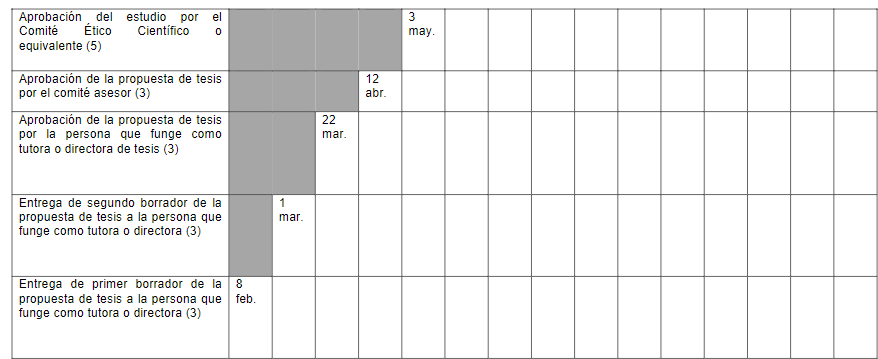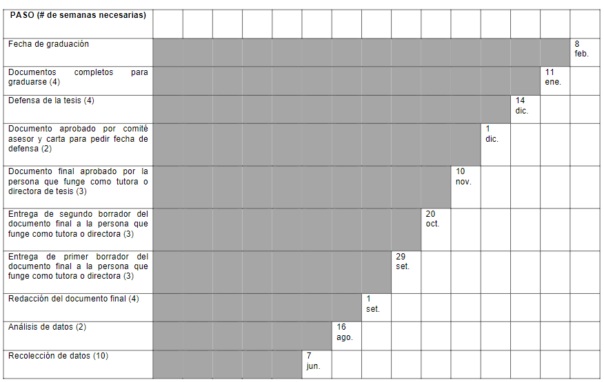 Recomendamos que cada estudiante establezca un cronograma razonable, partiendo de la fecha de graduación como su meta y definiendo cada uno de los pasos hacia esa meta devolviéndose en el tiempo. Muy probablemente el cronograma sufrirá varios ajustes, pero al menos permite tener una visión más precisa del tiempo que ocupará el proceso. La Figura 1 muestra un ejemplo de posible cronograma, ni conservador ni optimista, para un o una estudiante que dispone de los recursos para dedicarse a tiempo completo a sus estudios; somos conscientes de que, al menos en nuestro país, esta condición a menudo no se cumple. El ejemplo abarca un año calendario desde la entrega del primer borrador de la propuesta hasta la fecha de la graduación, suponiendo que el o la estudiante trabaja incansablemente para hacer las correcciones solicitadas por sus asesores. El ejemplo es para una tesis de maestría; naturalmente, la complejidad de la tesis y, por ende, la duración de algunas etapas será probablemente menor en tesis de grado y mayor en tesis de doctorado.