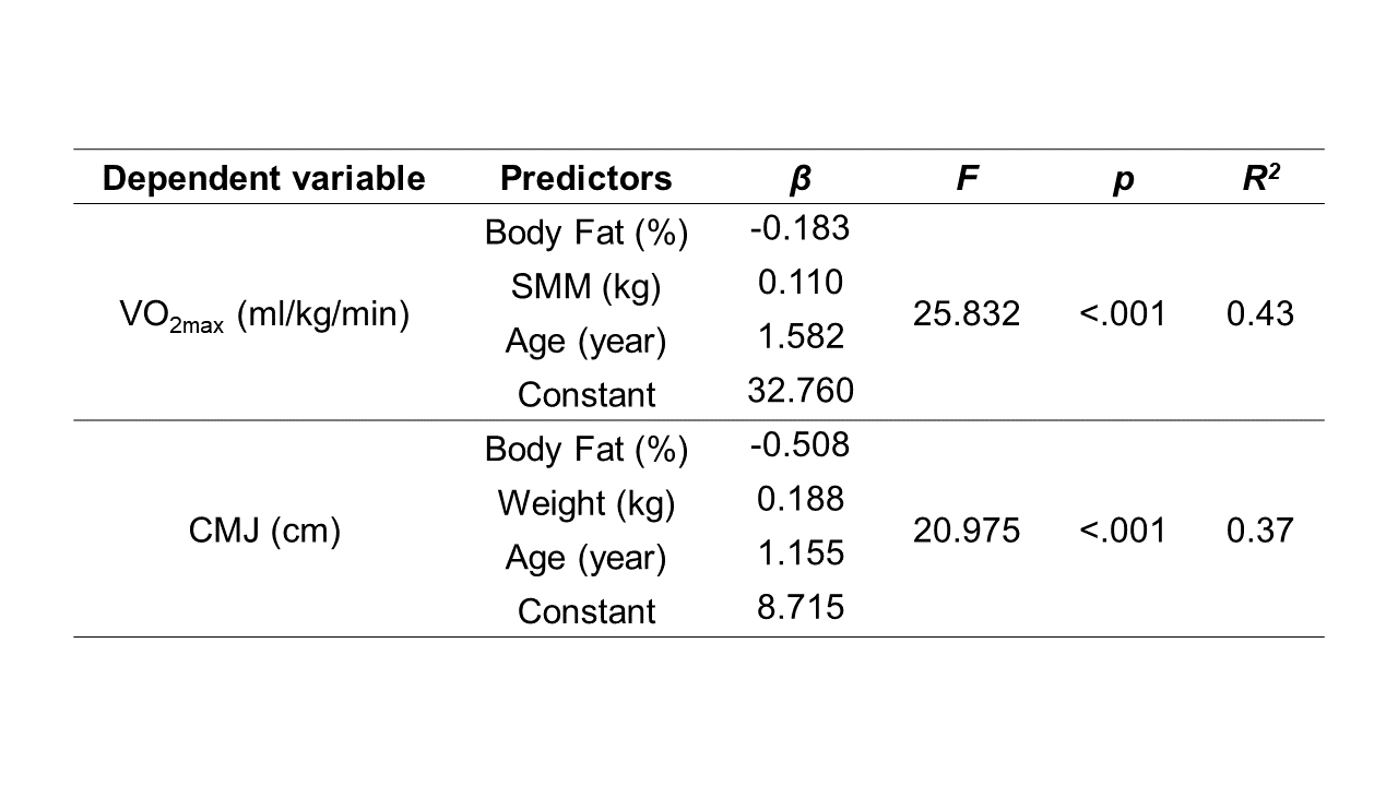 Multiple regressions analyses showed that body fat percentage, skeletal muscle mass, and age, significantly predicted 43% (R2= 0.43) of the VO2max. Likewise, body weight, skeletal muscle mass, and age predicted 37% (R2= 0.37) of the performance in the CMJ test. (See Table 4).