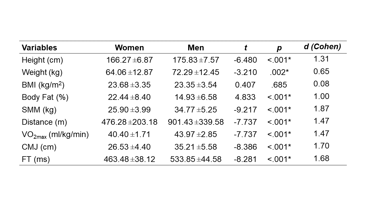 Table 1 shows differences between men and women in the analyzed variables, except for BMI. Men had a larger body height and weight than women. The percentage of body fat is higher in women, while the skeletal muscle mass is higher in men. In the physical capacities tests, the males showed higher results in the distance traveled in the Yo-Yo test and the VO2max, as well as the height and the flight time of the CMJ.