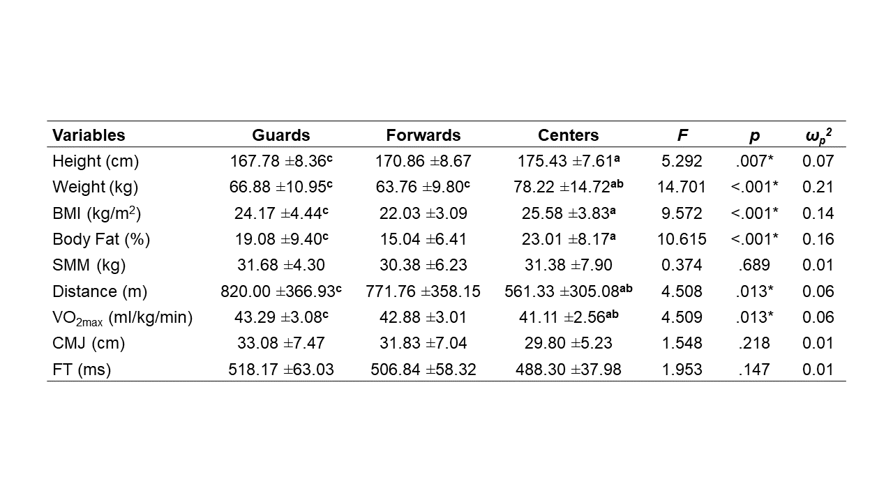 Table 2 shows the differences between playing positions. No significant differences were observed in SMM, CMJ and FT. The players who play the center positions are taller, have a higher weight and percentage of body fat than the other positions. The guards and forwards covered more distance in the Yo-Yo test, and their VO2max was higher compared to the centers.