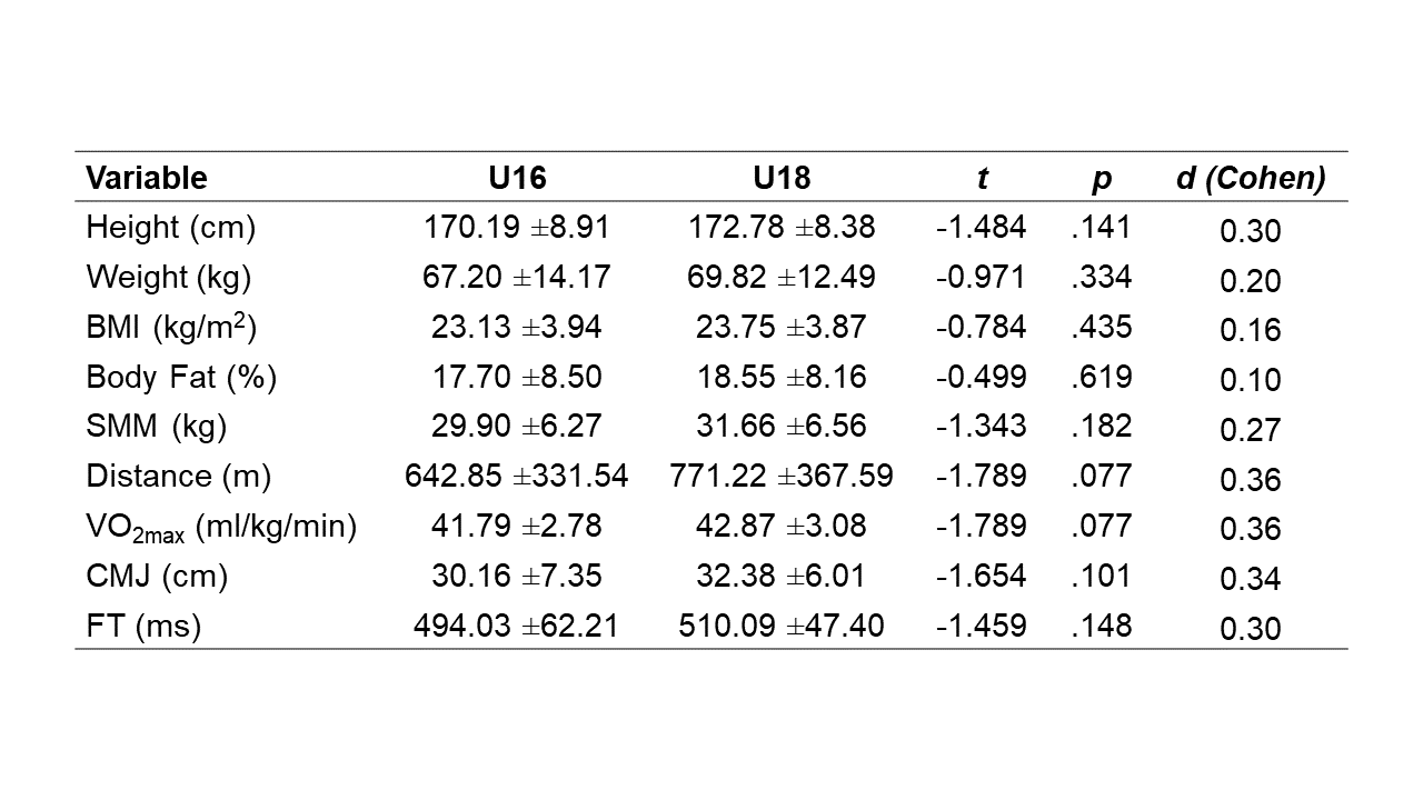 Regarding the comparisons between categories U16 and U18, no significant differences were found in any of the analyzed variables. The data can be seen in Table 3.